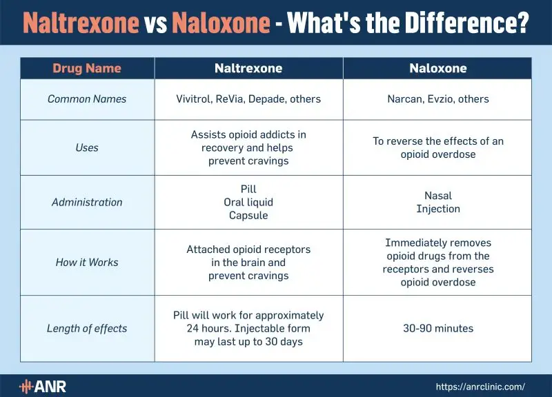 | Common Names | Vivitrol, ReVia, Depade, others | Narcan, Evzio, others |
